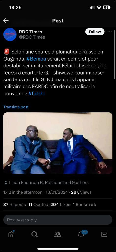 Rumeur collectée : " Selon une source diplomatique russe en Ouganda, Bemba serait en complot pour déstabiliser militairement Félix Tshisekedi. Il a réussi à écarter le général Tshiwewe pour imposer son bras droit, le Général Ndima dans l’appareil militaire des FARDC afin de neutraliser le pouvoir de FATSHI ".