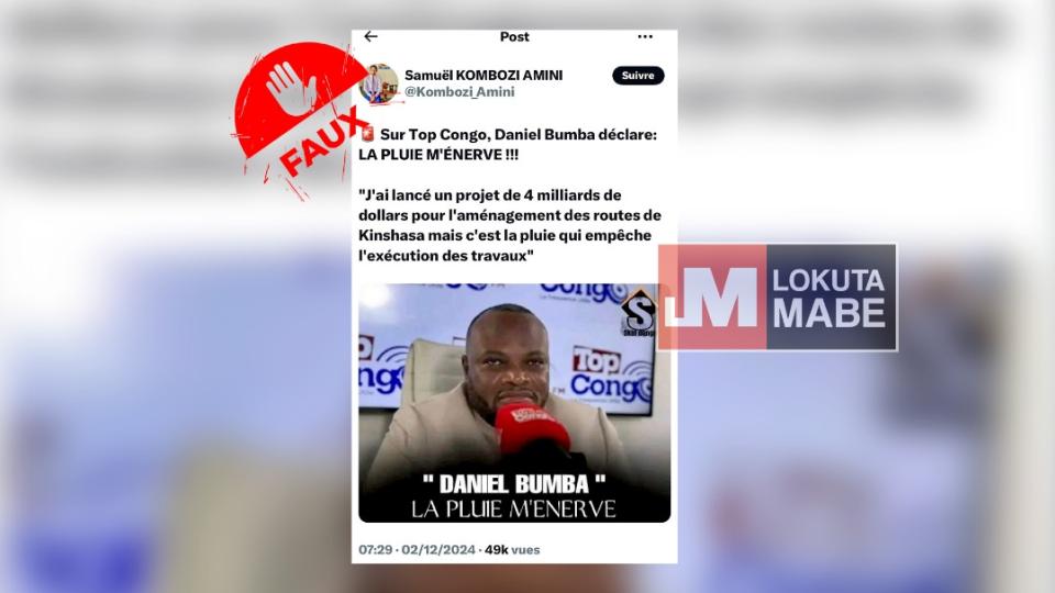 Sur X, un internaute affirme le 2 décembre 2024 que Daniel Bumba, gouverneur de la ville de Kinshasa, aurait déclaré sur Top Congo, une chaîne de radio basée à Kinshasa, que la pluie l’énerve et qu’il a lancé un projet de 4 milliards de dollars pour l'aménagement des routes à Kinshasa mais c’est la pluie qui empêche l'exécution des travaux. Faux, ces déclarations ne proviennent pas de Daniel Bumba.
