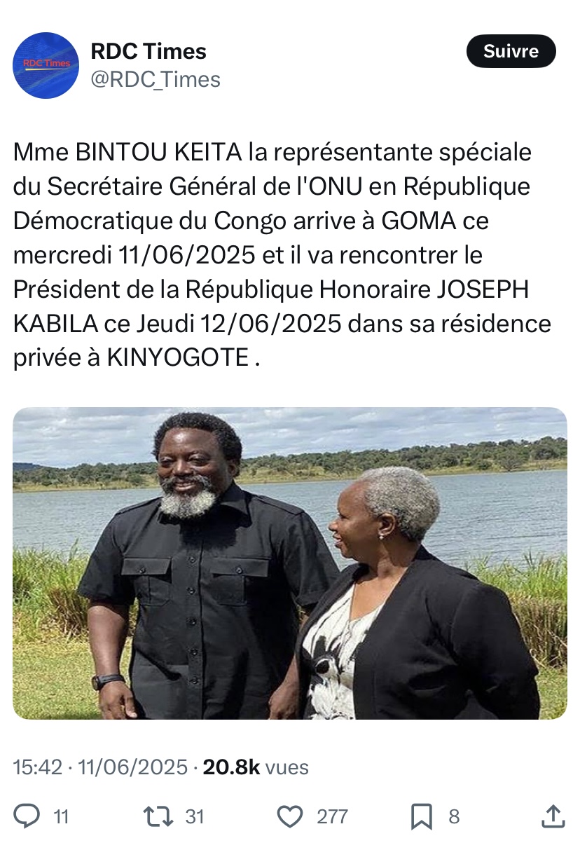 « Mme BINTOU KEITA la représentante spéciale du Secrétaire Général de l'ONU en République Démocratique du Congo arrive à GOMA ce mercredi 11/06/2025 et il va rencontrer le Président de la République Honoraire JOSEPH KABILA ce Jeudi 12/06/2025 dans sa résidence privée à KINYOGOTE . »