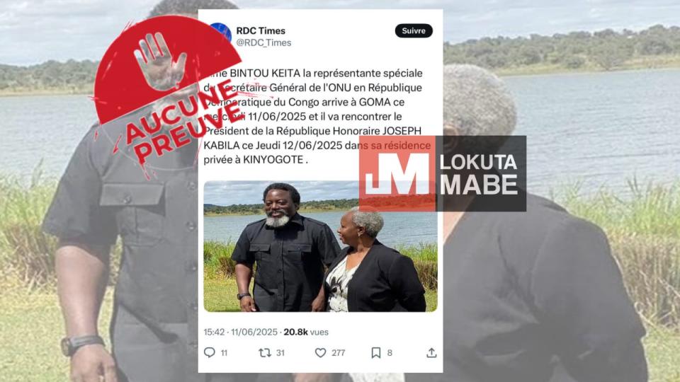 Sur le réseau social X, un compte a publié, le 11 juin 2025, une photo de l’ancien président de la République démocratique du Congo, Joseph Kabila et la cheffe de la Monusco et représentante du secrétaire général des Nations Unies en RDC, Bintou Keita. La légende accompagnant l’image affirme que la cheffe de la Monusco est arrivée à Goma et qu’elle allait rencontrer Joseph Kabila jeudi 12 juin dans sa résidence privée à Kinyogote. Contrairement à ce qu’affirme ce compte X, Bintou Keita est arrivée à Goma jeudi 12 juin 2025, et n’a pas rencontré l’ex-chef de l’Etat Joseph Kabila.