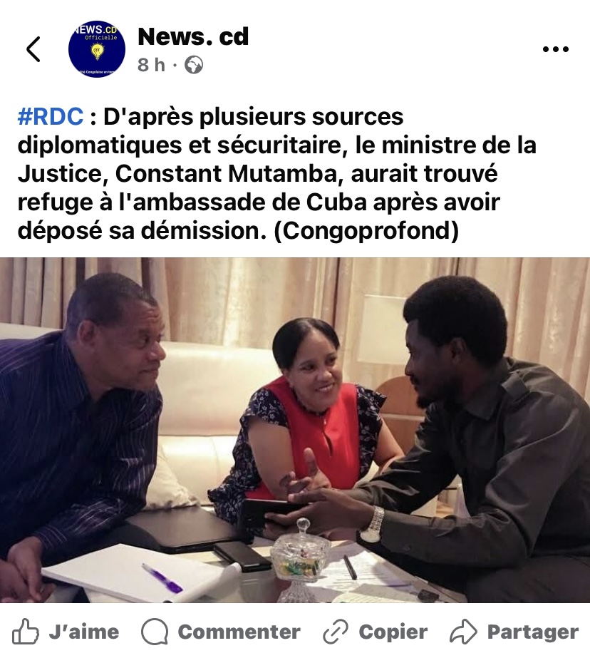 « D'après plusieurs sources diplomatiques et sécuritaires, le ministre de la Justice, Constant Mutamba, aurait trouvé refuge à l'ambassade de Cuba après avoir déposé sa démission. (Congoprofond) », affirme l’internaute.