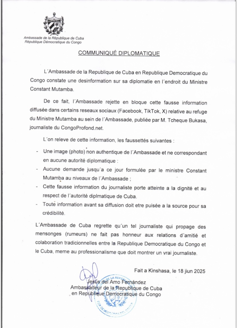 Nous avons contacté l’ambassade de Cuba via la messagerie WhatsApp, et celle-ci a démenti cette rumeur en nous envoyant un document où elle rejette toutes les affirmations faites sur les réseaux concernant le refuge de Mutamba au sein de l’ambassade de Cuba.