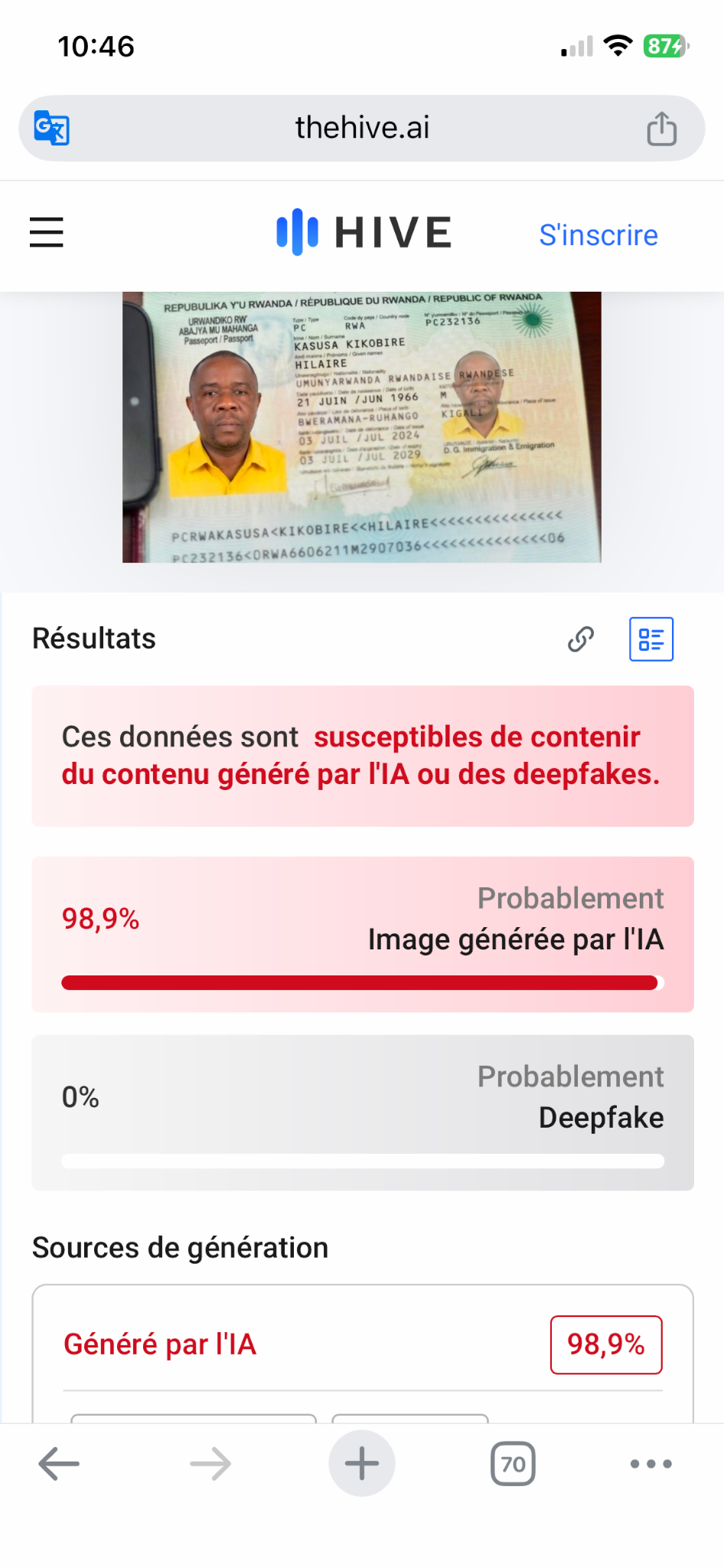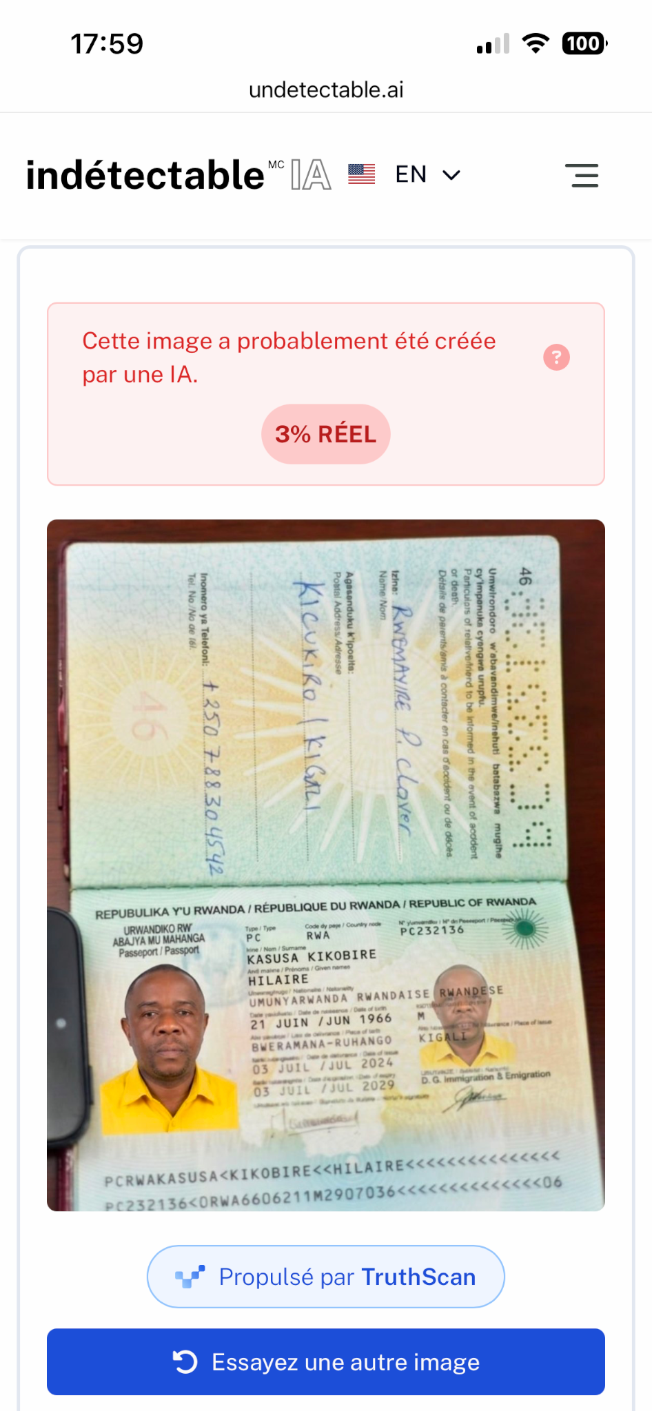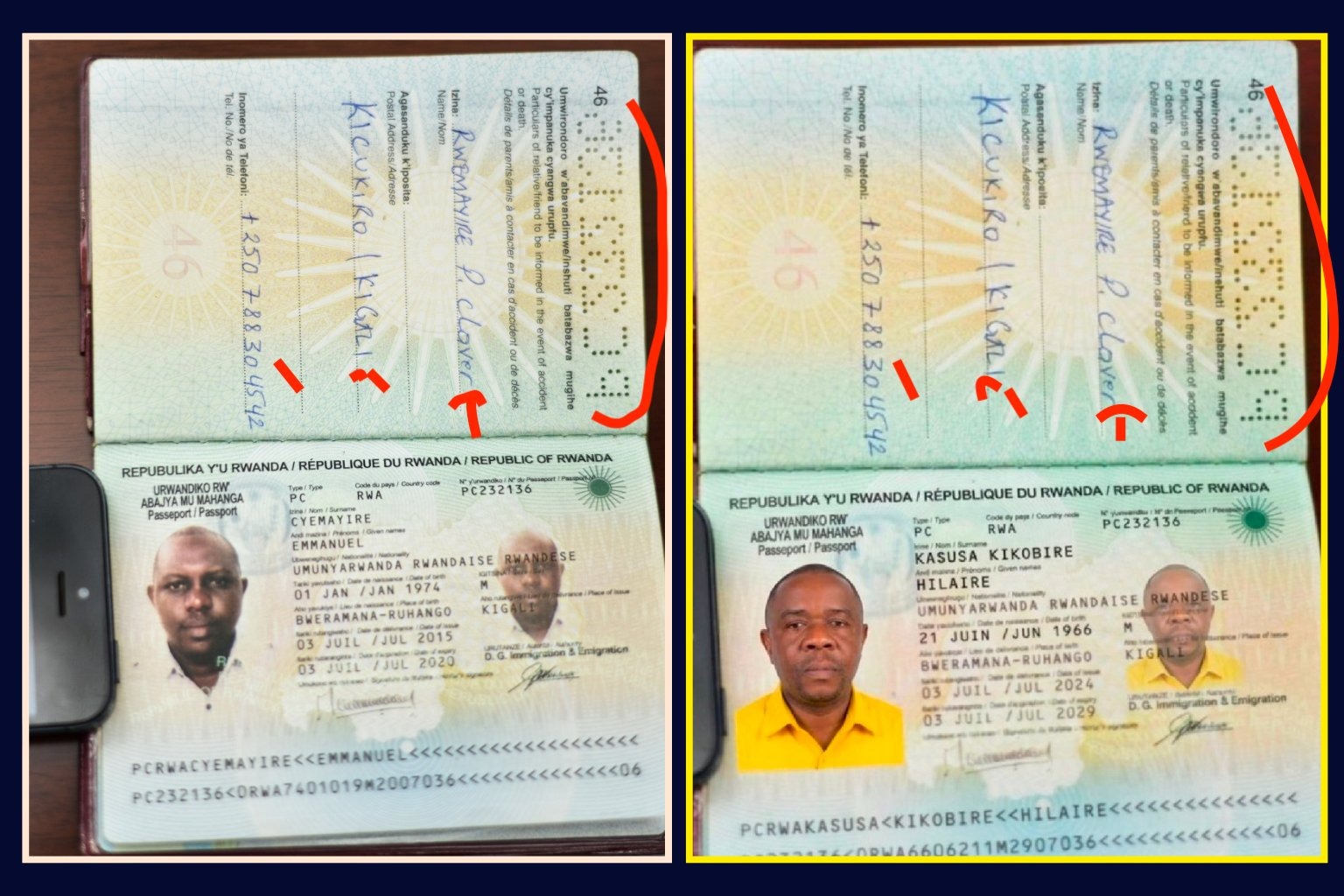 Des recherches par image inversée effectuées avec Google Lens ont révélé que le passeport rwandais attribué à Hilaire Kasuba Kakobya est falsifié. Il s’agit en réalité d’un montage réalisé à l’aide de Photoshop à partir d’un passeport authentique appartenant à Emmanuel Cyemayire, un citoyen rwandais expulsé d’Ouganda en janvier 2018 (lien archivé ici).