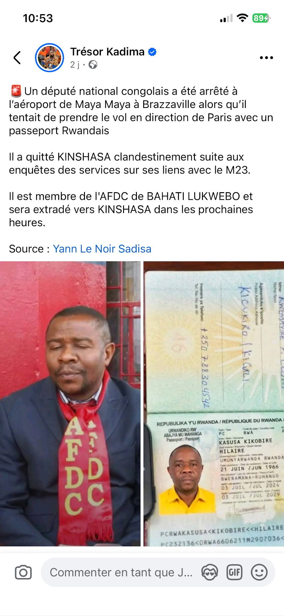 « Un député national congolais a été arrêté à l’aéroport de Maya Maya à Brazzaville alors qu’il tentait de prendre le vol en direction de Paris avec un passeport Rwandais », affirme ce post sur Facebook du 17 avril 2026. Il est accompagné de deux images. La première montre Hilaire Kikobya, vêtu d’un costume bleu foncé avec une écharpe aux couleurs de son parti, tandis que la seconde présente un passeport rwandais qui lui est faussement attribué.